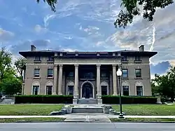 The house contains 20,021 square feet of living space spread over three floors, and an additional 3,136 square feet of basement,[4] making the Hales Mansion the largest residence in Oklahoma City. The mansion was designed by the firm Hawk & Parr and is constructed of Bedford limestone and bricks imported from Greece. The main entrance on the east facade is a large, two-story portico supported by eight Corinthian columns. The secondary entrance on the north facade, facing the Overholser Mansion, is also a two-story portico but supported by four columns. On the ground level, the main entrance opens into a grand hall and a grand staircase.