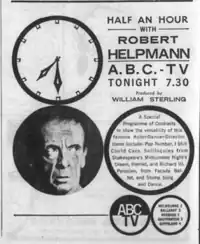 Half an Hour with Robert Helpmann is a 1964 Australian television program featuring Robert Helpmann.[2] Helpmann was in Australia for the Adelaide Arts Festival at the time and the program was devised to illustrate his versatility.[3]