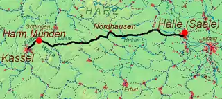 The Halle–Hann. Münden railway (also known along with a portion of the Hanoverian Southern Railway as the Halle-Kasseler Eisenbahn—Halle-Kassel railway) is a 218 km long main line operated by the Deutsche Bahn in Germany, which links Halle (Saale) in Saxony-Anhalt with Hann. Münden in the state of Lower Saxony. It is mainly used by regional and east-west goods trains. From 1990 to 1994 it was upgraded as part of a German Unification Transport Project.