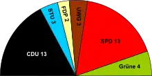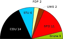 As a result of communal elections on August 30, 2009 currently the CDU, the SPD, The Greens, the FDP as well as two independent voters' alliances, the UWG and the STU (agenda party favouring a specific marked-out route for the unfinished motorway) are represented in the Halle town council.