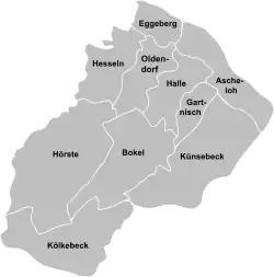 Halle (Westf.) is divided into ten urban districts, of which (besides Halle itself) only the industrial-suburban Künsebeck as well as the rural-agrarian villages Bokel, Hesseln, Hörste and Kölkebeck are built-up areas. While the rural-agrarian districts can be clearly distinguished as separate parts within the town limits the transition between Halle and Künsebeck is flowing. Oldendorf and Gartnisch have been entirely merged into Halle itself, Eggeberg and Ascheloh are only minor settlements. This segmentation is not regulated in the main statutes of Halle, no differentiation between the settlement areas is made there.