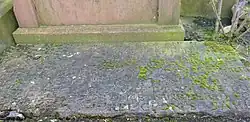 A memorial stone with a detailed inscription was carved in the 18th century, circa 1702 to 1714,[5] and was enclosed by iron railings with red sandstone corner pillars in 1832, when a new vertical gravestone with a finial and carvings of the martyrs faces was put alongside the old memorial stone, which lies horizontally.[2] The site is Category B Listed.[6]