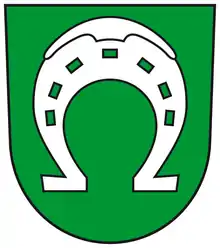 The former coat of arms depicts a downfacing silver horseshoe with a toe cap and seven rectangular nail holes on a green background.