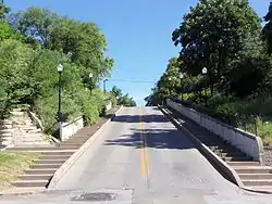 The geographical location of the Hamburg District is a fairly steep bluff north of the downtown area. The sidewalk on Ripley Street is replaced by steps as it climbs the hill. The area has the largest concentration of historically significant houses in Davenport.[9] As with other areas of the city, the simple Greek Revival style was the first to appear in Hamburg. These homes are generally at the base of the hill. The style is realized in cottages and the more popular two-story, 3-bay front gable homes. Other homes in the district include large Victorian homes in the Gothic Revival, Second Empire, Italianate, and the Queen Anne styles built in the 19th century. Many of these homes crown the bluff and offer vistas overlooking the river valley below. There are also examples of early 20th century Georgian Revival and American Craftsman homes. The historic district is rounded out by smaller and more simple late 19th and early 20th century homes and a few modern dwellings.