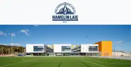 In 2014 it was announced that the schools would be merging into Hamelin-Laie and the construction of a new campus on the near town of Montgat began.[4] The building was carried out by the Alonso & Balaguer architecture studio (ABAA).[5][6] In 2016 the facilities were completed.[2] While now both Hamelin and Laie in a same building, they still remained with their own identity colors. Nevertheless, they abandoned their respective old logos and incorporated a new unified logo by Edgar Cueto.[7]