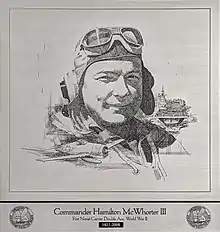 Commander Hamilton McWhorter III (February 8, 1921  April 12, 2008) was a United States Navy aviator and a flying ace of World War II, credited with shooting down twelve Japanese aircraft. He was the first Hellcat ace, first USN carrier-based double ace,[2][3] and the first Grumman F6F Hellcat pilot to achieve double ace status.[4][5] He flew 89 combat missions during World War II while flying with the VF-9 and VF-12 units.[5] On May 23, 2014, he was also posthumously awarded the American Fighter Aces Congressional Gold Medal, when the United States Congress collectively awarded the gold medal to all flying aces: a navy pilot is depicted on the medal in the upper right.[6][7]