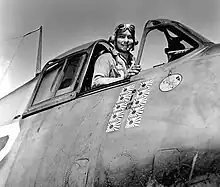 On a mission escorting SBD Dauntless dive bombers over Rabaul on November 11, 1943, McWhorter downed two Zeroes.[5][14] McWhorter's Hellcat was hit several times in the attack, but he was able to land on the Essex. The Hellcat sustained bullet holes on both sides of the fuselage and several that went straight through each wing.[5] During the February 17, 1944, Operation Hailstone airstrikes on Truk, McWhorter downed three Zeroes, bringing his score to ten victories. He thus became the first Hellcat double ace and the first carrier pilot double ace.[15][5] In his memoirs, McWhorter described the engagement: "My wingman and I ran into three Zekes. The first had a perfect bead on me, but for some reason didn't fire and Bud knocked him down. The other two ran right into my sights, one after the other, inside ten seconds and went down. Less than a mile away another Zero (later identified as "Hamp") was bearing down on me. He could have got me, but strangely, he didn't fire either. I let him have a burst and set him afire."[16]