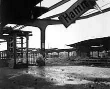 During World War II, the station was a prime target due to its strategic location and its large marshalling yard and suffered from numerous air attacks. Most of these were carried out by the British RAF Bomber Command.[6][7] Over 80% of Hamm lay in ruins after the war, and the station was no exception.[8] Passenger services resumed on 18 June 1945 on the line to Dortmund and Duisburg, and on 20 June that year on the lines to Bielefeld, Münster and Soest.