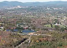 Hampshire College viewed from Bare Mountain in October 2017. Amherst College (top right) and The University of Massachusetts Amherst (top left) are both visible.