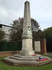 The Hampstead War Memorial is located in front of Heath House opposite Jack Straw's Castle, on the northern fringes of Hampstead Heath in London. The memorial marks the deaths of local individuals who died fighting in the First World War and the Second World War. It was dedicated on 4 May 1922 by the Bishop of Willesden, William Perrin, in a ceremony attended by Major General Sir Charles Vere Ferrers Townshend. The memorial is a tall thin stone obelisk on a square plinth with a three-step base.[1]
