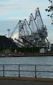 Coal cranes at the power plant seen from the shore of Merihaka.