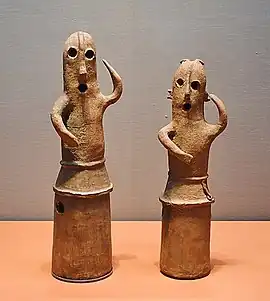 The Haniwa Terracotta Dancers (埴輪 踊る人々, haniwa odoru hitobito, haniwa dancing people) are a pair of human-shaped terracotta burial figures - haniwa - one smaller than the other, in the collection of the Tokyo National Museum. Their gestures with their arms have led them to be given the epithet of 'Dancers'.[1]