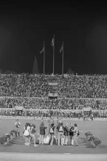 Hans-Jürgen Bombach (standing on the podium, on the right) after coming third place at the 1974 European Athletics Championships in Rome