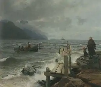 In Karlsruhe Gude continued to faithfully reproduce the landscapes he saw, a style that he passed on to his students by taking them to Chiemsee to paint the lake en plein air.[3][4] While on these trips Gude and his pupils often encountered Eduard Schleich the Elder with his own students from Munich who were, as Gude described, only out to capture the mood of the scene and were skeptical of the advantages of painting in the sunshine.[3] Gude also took special interest in how light reflected in water while in Karlsruhe, as well as expanding his study of the human figure.[3] Although Gude rarely portrayed humans for their own sake, he began populating his paintings with convincing, if sometimes anatomically incorrect, individuals.[3]