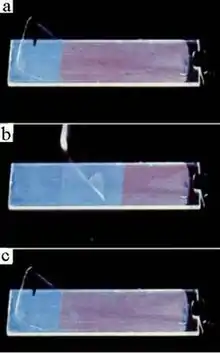 Separating and contacting (from a to b and from b to c) in atomic precision. Monolayer of a blue fluorescent dye (donor) on a glass slide partially covered by a monolayer of a red fluorescent dye (acceptor) fixed at a PVA-polymer layer. Energy transfer from donor to acceptor at contact.[23] Courtesy Dietmar Möbius. Reproduced with permission, Wiley-VCH Verlag