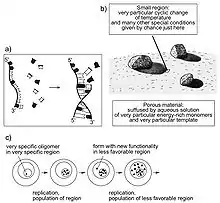 (a) Modeling emergence of first replicating strand (oligomer R). (b) Very particular location on the prebiotioc planet. Arrow: small region, very particular cyclic change of temperature and many other special conditions given by chance just here. (c) Evolution of increasingly complex self-reproducing forms by populating increasingly unfavorable regions.