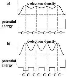 Polyene: potential energy (troughs of the nuclear shells neglected) and π-electron density. a) Instability of equal bonds. b) Stabilized by alternation of single and double bonds (bond length consistent with π-electron density (BCD)-approximation).