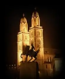 The Grossmünster with the 1937 equestrian monument to Hans Waldmann.