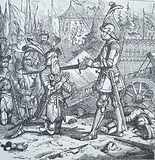 Knighting of Hans Waldmann before the Battle of Morat in June 1476.