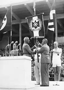 On 17 August 1936, von Tschammer was appointed to the Prussian State Council by Prussian Minister President Hermann Göring.[10] The 1936 Summer Olympics in Berlin were held during von Tschammer's tenure as Reichssportführer and President of the German Olympic Committee. He played a major role in the structure and organization of the Olympic Games together with Carl Diem, who was the former secretary of the Deutscher Reichsausschuss für Leibesübungen (DRA).[11] Von Tschammer entrusted the organization of the Fourth Winter Olympics in Garmisch-Partenkirchen to Karl Ritter von Halt, whom he named President of the Committee for the organization of the games. Von Tschammer would be later blamed by historians for enforcing a ban on non-Aryans in Germany's Olympic team, a fact that was condemned internationally as a violation of the Olympic ethical code.[12] But it is doubtful that he was the only one of the NSRL leaders behind that decision.