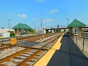 ![]() Hanson Park station in September 2016. The bridge for N. Central Avenue is visible in the background. The holding freight railroad tracks are to the far right. | |||||||||||||||||||||||