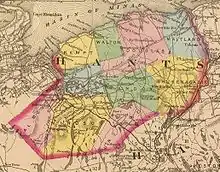 The county of Hants was established June 17, 1781, on territory taken from Kings County and consisted of the townships of Windsor, Falmouth and Newport.[3] The name Hants is an old abbreviation for the English county of Hampshire, from the Old English name Hantescire. In 1861, Hants County was divided for court sessional purposes into two districts named East Hants and West Hants. In 1879, the two districts were incorporated as district municipalities. In 2020, the Town of Windsor amalgamated with the District of West Hants to become the West Hants Regional Municipality.[4]