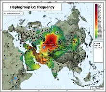 The highest reported concentration of G1 and its subgroups in a single country is in Iran, with next most frequent concentrations in neighboring countries to the west. Specifically G1 was found in 5% of 177 samples from southern Iran in one study. The same study found G1 in 3% of 33 samples in northern Iran. The percentage in the south was almost equal to the percentage of G2, the only region in the world where G2 types were not found to be heavily dominant.[6] Earlier studies which found about the same percentages of G in various parts of Iran failed to test specifically for G1.[7][8]