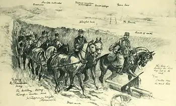 As Rosetti reports, Lecca was for a while employed as a regular journalist by Gazeta Poporului, while he himself worked at Țara; the two would jibe at each other using notes and epigrams in each one's newspaper.[42] Lecca was also an amateur draftsman, who contributed 89 vignettes to his own Octava, 18 of which were copied from other artists.[43] He and Hasdeu shared this preoccupation, as well as a passion for the occult, spiritism, and mediumship, with Lecca going into trances, attempting to draw for Hasdeu the "real face of Christ".[44] During such séances, attended by the poet, Hasdeu was inspired to build his folly castle in Câmpina,[45] where he later displayed a group photograph of Lecca, Rosetti and Ovid Densusianu.[46] In January 1899, when Hasdeu created his "Society of the Press", a pioneering writers' syndicate, Lecca, Ascanio and Chendi were among the founding members.[47]