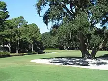Several holes have a very small margin of error between greens and water hazards (4, 8, 14, 17, 18). Tee shots and lay-ups must be placed in the strategic part of fairway in order to have a direct shot into the green. Sometimes golfers get blocked out by overhanging trees, even if they are in the fairway. Holes in which players may be blocked out from the fairway include numbers 1, 2, 8, 9, 10, 11, 12, 13, 15, and 16. Compared to other courses Harbour Town has high percentage of holes with this challenge.[11]