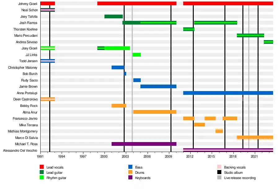 | Lead guitar | Neal Schon | Josh Ramos | Josh Ramos | Thorsten Koehne | Josh Ramos | Mario Percudani | |||||||||