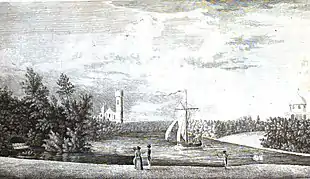 John Burdon was born in 1711 in South Shields, then in County Durham. His father was Nicholas Burdon, a wealthy salt and shipping merchant. He remained a bachelor all of his life. When his father died in 1847 John inherited his fortune,[11] and was able to purchase the Hardwick Estate and spend a large sum on elaborate pleasure gardens. The gardens were described in publications of the time: Hutchinson in 1785 says that they are "laid out with exquisite taste" and then details buildings and ornaments.[12] The book includes an engraved drawing of the park which is shown above right.