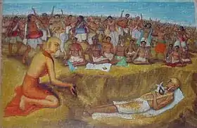 It is believed that Haridasa was buried on the ocean shore by Caitanya himself.[26] Dr. A. N. Chatterjee makes a point in his doctoral thesis entitled "Chaitanya's impact on medieval Indian society" that death of Haridasa Thakura is one of the most important incidents which deserve mention when dealing with the last few years of Caitanya Mahaprabhus life.[22] Haridasa dies after most of other Gaudiya Vaishnavas depart home from Puri, he collapses one day while singing Krishnas name. He is then placing a foot of Chaitanya Mahaprabhu on his chest and dies crying out "Sri Krishna Chaitanya".[27]