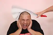 The harisen (ハリセン/張り扇, meaning "slapping fan") is a giant paper fan, usually made in a closed fashion. It is most traditionally used as part of a manzai act, in which the straight man (tsukkomi) smacks the funny man (boke) in response to their jokes or idiocy.