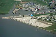 Harlesiel outer harbor, with ferry terminal and recreational facilities. The pumping station/lock is at the extreme right.