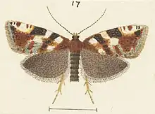 The wingspan is about 14 mm. The forewings are white with ferruginous markings, mixed with ochre and black. The hindwings are dark fuscous.[2]