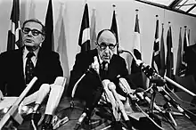 In Middle East affairs, Brown supported President Carter's efforts as an intermediary in the Egyptian-Israeli negotiations leading to the Camp David Accords of September 1978 and the signing by the two nations of a peace treaty in March 1979.[2][4] Elsewhere, the fall of the Shah from power in Iran in January 1979 eliminated a major U.S. ally and triggered a chain of events that played havoc with American policy in the region. In November 1979, Iranian revolutionaries occupied the U.S. embassy in Tehran and took more than 50 hostages. Brown participated closely in planning for a rescue operation that ended in failure and the loss of eight U.S. servicemen on April 2425, 1980. Not until the last day of his administration, on January 20, 1981, could President Carter make final arrangements for the release of the hostages.[2][4]