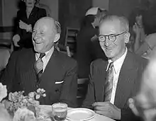 From time to time Larwood supplemented his wages by commenting on cricket for newspapers and broadcasters.[133] At first he was treated with some suspicion by English touring teams; in 1950–51 when he visited the English dressing room he received a cold reception from the England captain, F.R. Brown. Four years later, according to Larwood, he was kept out of the dressing room by Trevor Bailey, the 1954–55 team's vice captain—though Bailey denied that this ever happened.[134] However, from the early 1960s onwards Larwood was often visited by members of England teams, and he became a regular and welcome guest in English dressing rooms. He sometimes went to cricket events where he would occasionally meet Don Bradman; relations between the two, though outwardly cordial, remained essentially cold.[131][135]