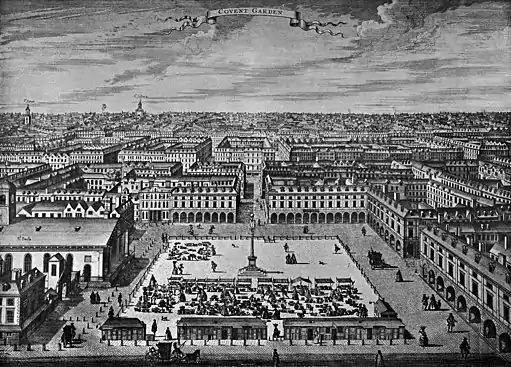 Harris's List was published for a city rife with prostitution. London's bawdy houses had, by the 1770s, disappeared from the poorer areas outside the city wall, and in the West End were found in four areas: St Margaret's in Westminster; St Anne's in Soho and St James's; and most especially, with more than two-thirds of London's "Disorderly Houses", around Covent Garden and the Strand.[53] The area was noted for its "great numbers of female votaries to Venus of all ranks and conditions", while another author distinguished Covent Garden as "the chief scene of action for promiscuous amours."[54] The Scottish statistician Patrick Colquhoun estimated in 1806 that of Greater London's approximately 1,000,000 citizens,[55] perhaps 50,000 women, across all walks of life, were engaged in some form of prostitution.[56]