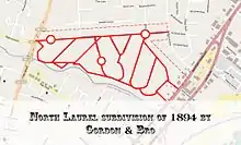 Prior to the industrial settlements of mills along the Patuxent river. The Gordon property was patented as part of Alexander and Absolute Warfield's estate "Warfield's Range", which was resurveyed as "Sappington's Sweep" as part of a 1731 inheritance to Thomas Sappington from his grandfather Thomas Rutland.[1] What later became Route 1 was built along the property in 1749 and was operated as a turnpike from 1820 to 1865. In 1870, John and Elizabeth Water sold their interest in Sappington's sweep to William and Mary Cissel in 1890. The property was sold the same year for $35,000 to brothers Harry D. and Fulton R. Gordon from Bailey's Crossroads, who subdivided a tract on the Howard county side of the Patuxent river to form "North Laurel".[2][3] The business office for the development was operated out of an office on 918F Street in Washington as Gordon & Bro, marketing real estate in the "suburbs" between Baltimore and Washington.[4] By 1894, the Gordon brothers sold a portion of "North Laurel" for $64,000 to the Key Brothers & Company to finance the purchase of the Lincoln Hotel in Washington D.C. Fulton Gordon divorced shortly afterward and declared himself broke.[5][6] The brothers built an American Foursquare on "Lot 10" prior to 1905 sitting prominently along route one with a large stone retaining wall.[7] The house remained in their name until the late 1930s while the brothers developed land that would become Chevy Chase, Maryland. Land subdivision would be a booming business a century later, the "smart growth" features of tightly clustered lots featuring access to light rail services, walkable community and the county's first traffic circles remained largely undeveloped until the 1960s with some lots vacant today. Fulton R. Gordon was quoted as saying if the land had been given to him "I'd have been robbed".[8]