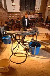HHSB is historically noteworthy as the first symphonic band to have instruments in which the initial sound-producing mechanisms of the instruments cover all three states of matter: solid, liquid, and gas. While other orchestras have three categories of instruments (strings, percussion, and wind), two of these categories (strings and percussion) use matter in its solid state, and one category (wind instruments) uses matter in its gaseous state. HHSB is, in some sense, the first large symphonic orchestra to use hydraulophones, musical instruments that produce the initial sound by way of matter in its liquid state.