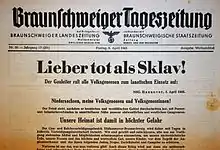 Headline of the Braunschweiger Tageszeitung of 6 April 1945 with an article by Gauleiter Lauterbacher entitled: "Better Dead than a Slave"