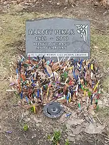 Pekar was interred at Lake View Cemetery in Cleveland.[47] His headstone features one of his quotations as an epitaph: "Life is about women, gigs, an' bein' creative."