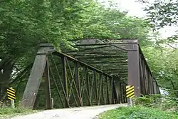 The Harvey Railroad Bridge is a historic structure located east of Harvey, Iowa, United States. It spans an old channel of the Des Moines River for 600 feet (180 m).[2] The Albia, Knoxville and Des Moines Railroad (AK&D) was planned to traverse the central part of Marion County. Even though a special tax in the townships the tracks would pass through was approved in 1870, they were unable to complete the line. The Chicago, Burlington and Quincy Railroad (CB&Q) acquired the AK&D's assets in 1875 and completed the line. Initially, the tracks did not cross the Des Moines River where the railroad employed ferries or a temporary bridge. The CB&Q contracted with the American Bridge Company in 1878 to fabricate the wrought iron Pratt through truss span. Stone abutments and piers support the bridge. It is not known whether the CB&Q or AmBridge built the span.[2] It remained in use as a railroad bridge until 1938 when the county acquired the bridge and the right-of-way for a county road. The river itself has subsequently been rerouted, and now the bridge crosses a narrow stream. The bridge was listed on the National Register of Historic Places in 1998.[1]