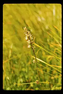 This is a perennial herb growing from a black bulb 2 to 4 centimeters long and producing an erect flower stem up to 50 centimeters tall. A number of long, bending leaves surround the stem at its base, and the rest of the stem is naked. The top portion of the stem is a narrow, pointed inflorescence of many white or greenish lilylike flowers. Each small flower has six curled perianth parts and six protruding stamens with very large anthers. The flowers fall away to leave the developing fruits, which are capsules a few millimeters wide containing black seeds.