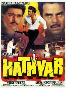 Hathyar (transl. Weapon) is a 1989 Indian Hindi-language action crime film written and directed by J. P. Dutta.[2][3] It features an ensemble cast of Dharmendra, Sanjay Dutt, Rishi Kapoor, Amrita Singh, Sangeeta Bijani, Asha Parekh, Paresh Rawal and Kulbhushan Kharbanda. The film focuses on how poverty forces a youngster (Dutt) to turn to crime by joining forces with the biggest don in town (Dharmendra), much to the chargin of his mother (Parekh), his lover (Singh) and his friend and the don's brother (Kapoor).