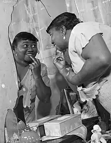 For her performance as the house servant who repeatedly scolds her owner's daughter, Scarlett O'Hara (Vivien Leigh), and scoffs at Rhett Butler (Clark Gable), McDaniel won the 1939 Academy Award for Best Supporting Actress, the first Black actor to have been nominated and win an Oscar. "I loved Mammy," McDaniel said when speaking to the white press about the character. "I think I understood her because my own grandmother worked on a plantation not unlike Tara".[26] Her role in Gone with the Wind had alarmed some whites in the South; there were complaints that in the film she had been too "familiar" with her white owners.[27] At least one writer pointed out that McDaniel's character did not significantly depart from Mammy's persona in Margaret Mitchell's novel, and that in both the film and the book, the much younger Scarlett speaks to Mammy in ways that would be deemed inappropriate for a Southern teenager of that era to speak to a much older white person, and that neither the book nor the film hints of the existence of Mammy's own children (dead or alive), her own family (dead or alive), a real name, or her desires to have anything other than a life at Tara, serving on a slave plantation.[28]:114,n. 40,p. 115,n. 47 Moreover, while Mammy scolds the younger Scarlett, she never crosses Mrs. O'Hara, the more senior white woman in the household.[28]:114,n. 40,p. 115,n. 47 Some critics felt that McDaniel not only accepted the roles but also in her statements to the press acquiesced to Hollywood's stereotypes, providing fuel for critics of those who were fighting for Black civil rights.[28]:114,n. 40,p. 115,n. 47 Later, when McDaniel tried to take her "Mammy" character on a road show, Black audiences did not prove receptive.[9]:188–190