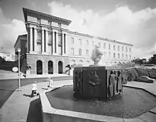 City hall with the fountain "By og hav" (City and sea) by Nils Erik Flakstad at the City Hall Square in 1973 (National Library of Norway)