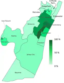 During the latter half of the 20th century, Cuban émigrés and exiles left their country and relocated to Union City, West New York, and surrounding communities in search of economic opportunity and political freedom.[2] Although the area during this period became significantly influenced by Cuban culture, over the course of the decades that followed, many Cubans spread into adjacent towns and many other Hispanic groups also moved into the area, resulting in a widespread and diverse Latino culture, commerce and identity that is non-exclusive of any people of Hispanic descent,[3][4][5][6][7] though Cubans remain a powerful voting bloc.[1][8] Numerous towns on the Hudson Palisades in northern Hudson and southeast Bergen counties have populations where more than 50% of the residents are foreign-born,[9] often with a Hispanic majority.[10] Some of its towns are among the most densely populated in the U.S.,[11][12] three of which, Guttenberg, Union City, and West New York, are the top three most densely populated municipalities in New Jersey.[13]