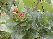 Within the group, distinct taxa vary in berry color (red, yellow, black, blue), bloom color (white, red, pink and green), foliage shape and size, and pedicel length.[5][4] Vaccinium reticulatum and Vaccinium dentatum are evergreen, while Vaccinium calycinum is deciduous.[1][5] All three species tend to fruit and flower throughout the year, but maximum flower and fruit production generally occurs during May - July.[5] Outcrossing between all three species has been successful, and many hybrids have been described. All three species are also capable of selfing, but resulting seed viability differs throughout the species complex.[5]