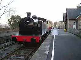 The NER section of the line lost its passenger service in April 1954, but the station retained a nominal service of one train each way from Hawes Junction (by then renamed Garsdale) until final closure to passengers on 16 March 1959. Goods traffic from the Leyburn direction continued until complete closure in April 1964,[5] after which the track was lifted and the buildings left to fall into disrepair. However, after many years of disuse, the site was purchased by the Yorkshire Dales National Park Authority and converted into a museum and tourist information centre in the early 1990s, a role it continues to fulfil to this day.[6] As part of this scheme, the station buildings and platforms were refurbished, a short length of track relaid. A preserved industrial tank locomotive, cosmetically painted in British Railways colours, together with a pair of ex-BR Mark 1 coaches, were installed as a static exhibit (see accompanying photo).